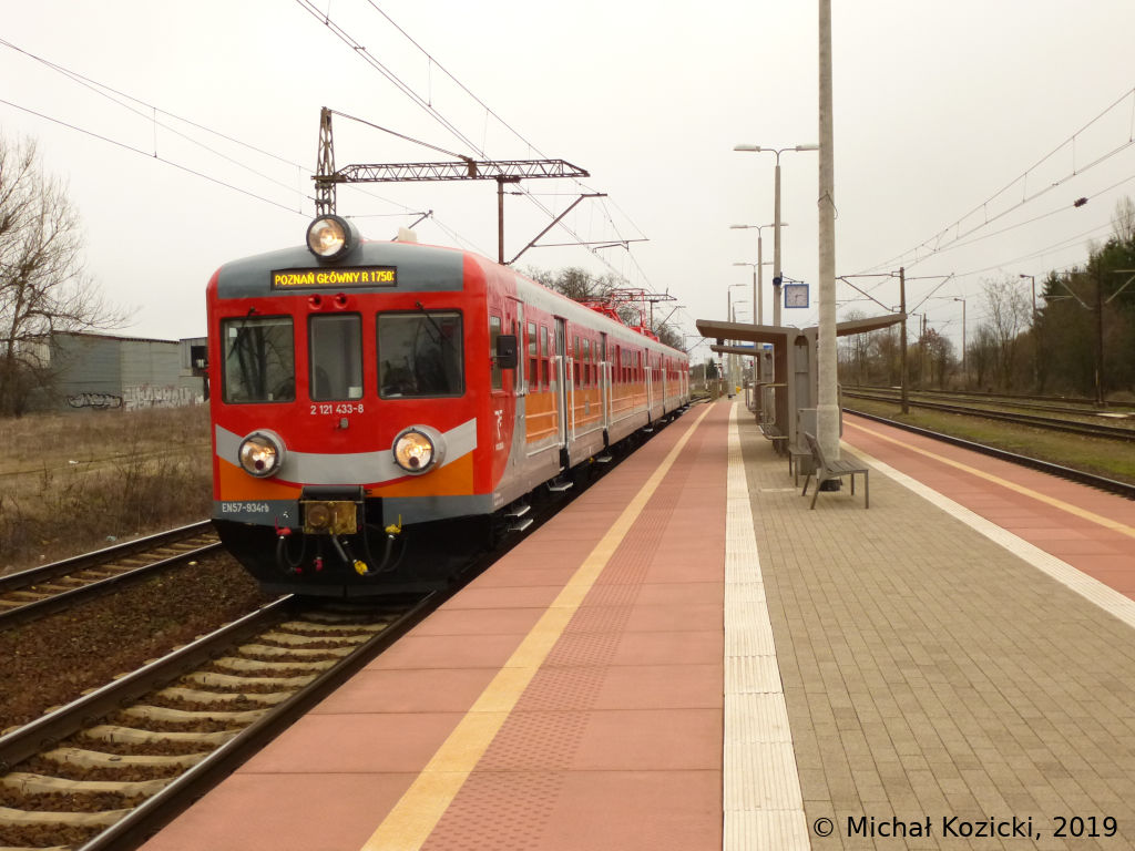 PolRegio EN57-934 is stopping at Poznan Krzesiny on a service from Lodz Kaliska to Poznan Gl., Poland, 10.03.2019.