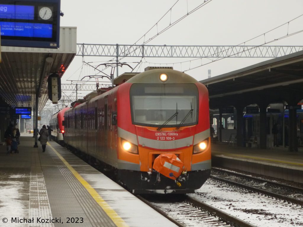 PolRegio EN57AL-1369 departs from Poznan Gl. on a service to Kolobrzeg, Poland, 21.11.2022.