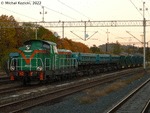 Cargounit SM42-633 with a short train of empty Dolkom gravel dumpers and ballast hoppers stands at Jelenia Gora, Poland, 09.10.2022.