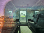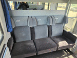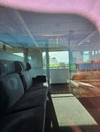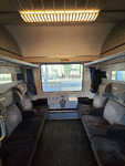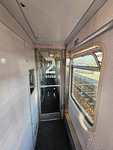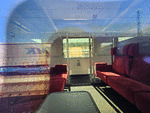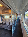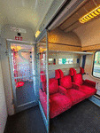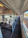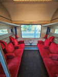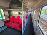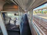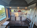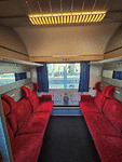 An interior in a private passenger car type "Avmz", owned by private operator "PIMK Rail Express", part of "PIMK Rail" at railway station Pazardjik in composition of test train.