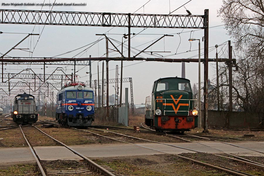 Zaklady Naprawcze Taboru Kolejowego i Miejskiego ZNTKiM Gdansk 401Da-471, EU07-417 (Majkoltrans) and SM42-2615 (Lotos Kolej), maneuvers on the station 10.03.2015, Gdansk Kanal Kaszubski Photo W. Kolins |