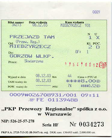 PKP ticket for a journey on the re-opened (for passenger traffic) line 343, from Miedzyrzecz to Gorzow Wlkp. This ticket was issued in Miedzyrzecz and is of a completely different type compared with the one issued in Gorzow Wlkp for the opposite direction.