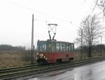 Bright red tram on a pale grey day: Tramwaje Slaskie no. 505 leaving the suburbs of Katowice for Myslowice, seen near Szopienice.