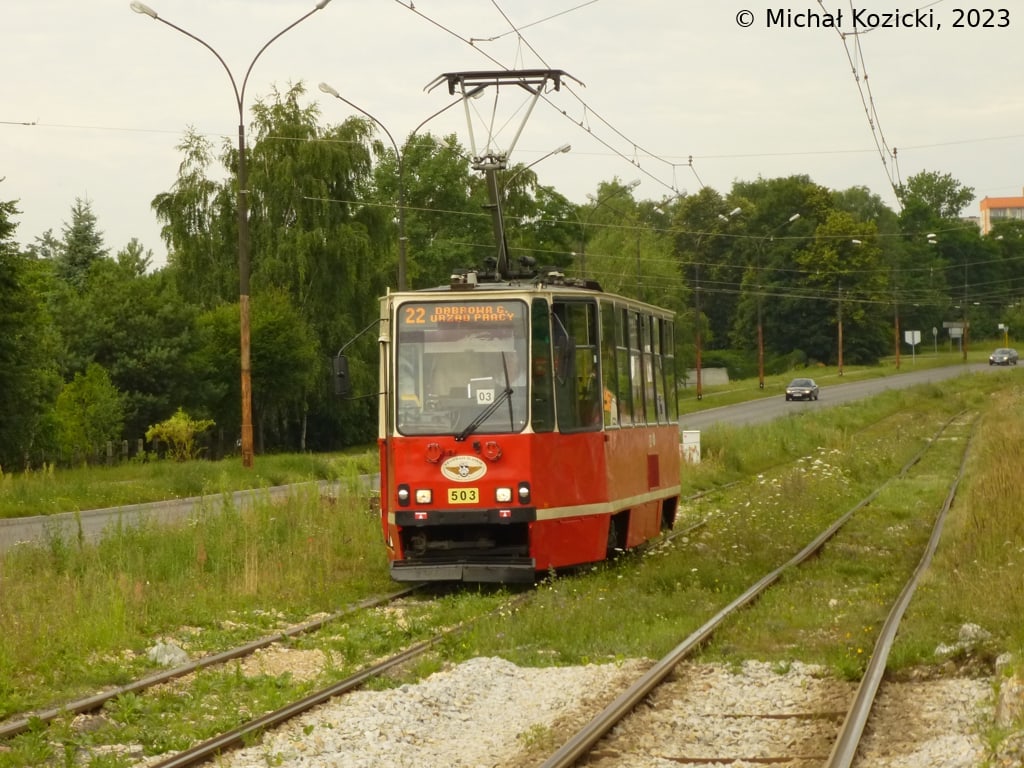 Konstal 105Na No. 503 on route 22 before stopping at Urzad Pracy, Dabrowa Gornicza, Upper Silesia, Poland, 10.07.2023.