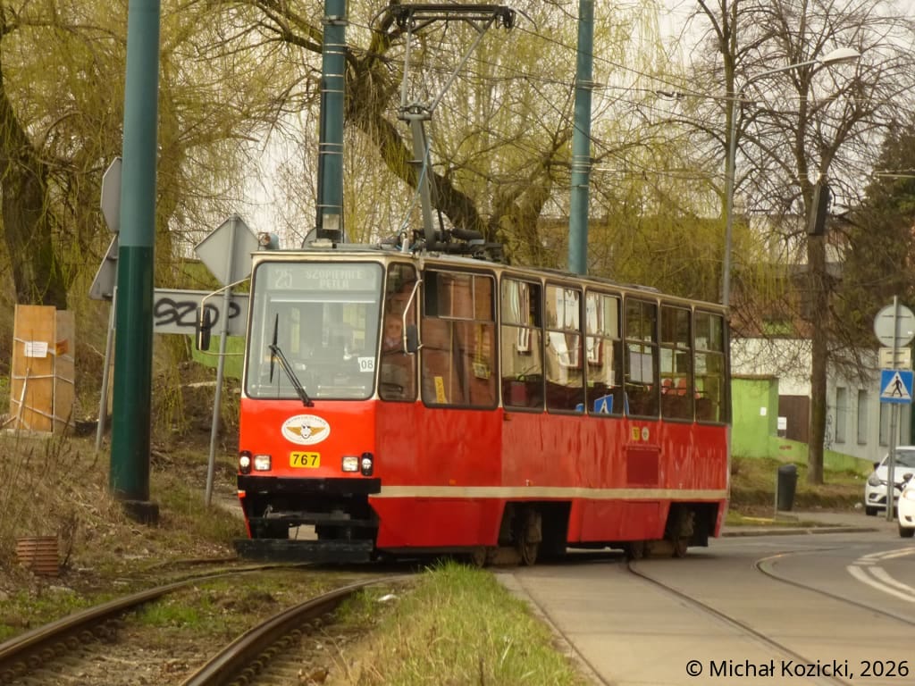 Konstal 105Na No. 767 on route 25 is descending towards the old and cramped tunnel under the Katowice-Warsaw railway line to the Szopienice end loop, Katowice, Poland, 25.03.2025.