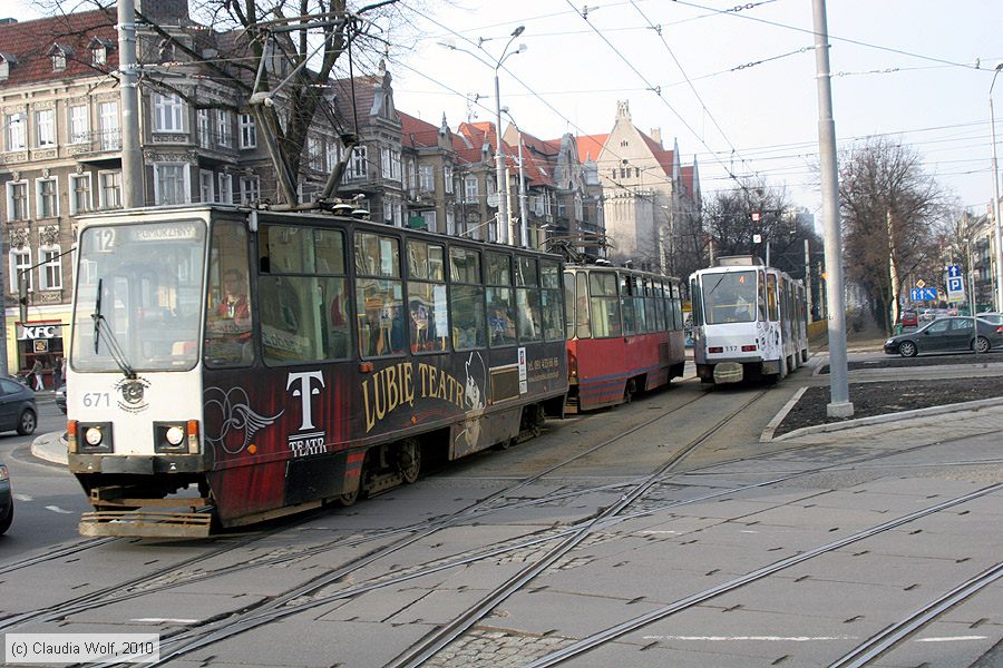 Straßenbahn Szczecin (Stettin) - 671 Triebwagen 671 auf Linie 12 bei der Haltestelle Plac Kościuszki am 18. März 2010.