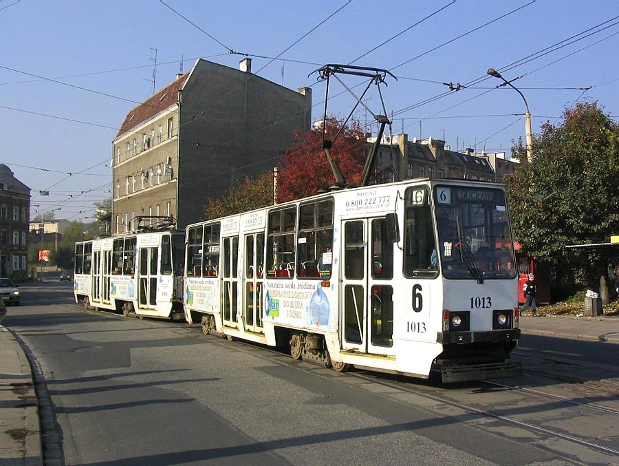 Straßenbahn Szczecin (Stettin) - 1013 Triebwagen 1013 (Typ 105Na, Baujahr 1992) auf Linie 6 bei der Haltestelle Dworzec Główny am 18. März 2010.