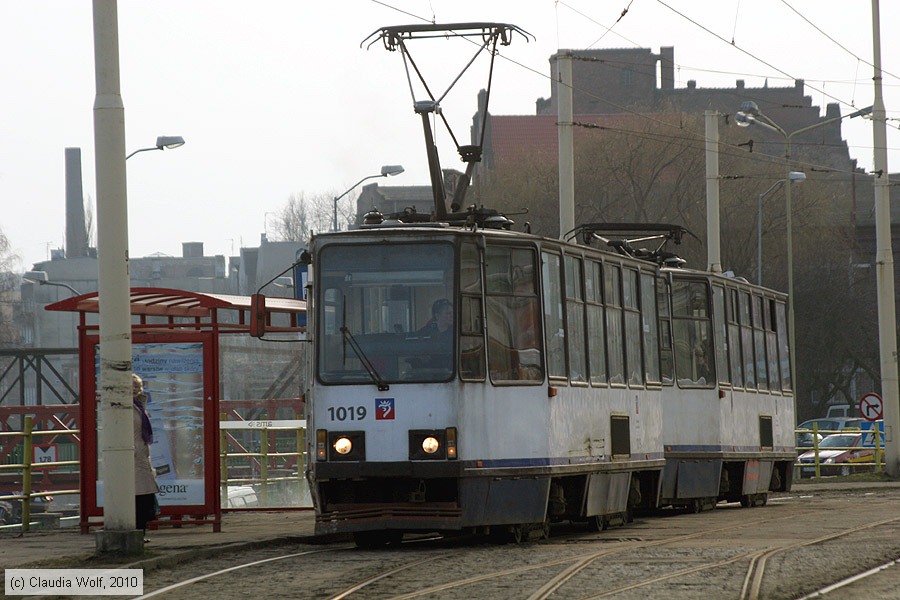 Straßenbahn Szczecin (Stettin) - 1019 Triebwagen 1019 an der Haltestelle Dworzec Główny am 18. März 2010.
