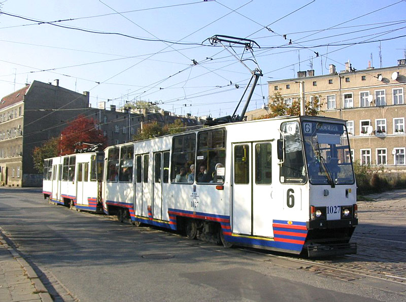 Straßenbahn Szczecin (Stettin) - 1027 Triebwagen 1027 auf Linie 6 beim Bahnhof Szczecin Główny am 18. März 2010.