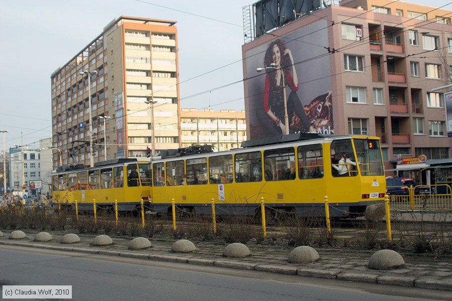 Straßenbahn Szczecin (Stettin) - 1204 Triebwagen 1204 auf Linie 5 bei der Haltestelle Plac Rodła am 18. März 2010.