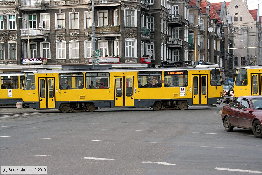 Straßenbahn Szczecin (Stettin) - 1210 Triebwagen 1210 auf Linie 8 bei der Haltestelle Plac Kościuszki am 18. März 2010.