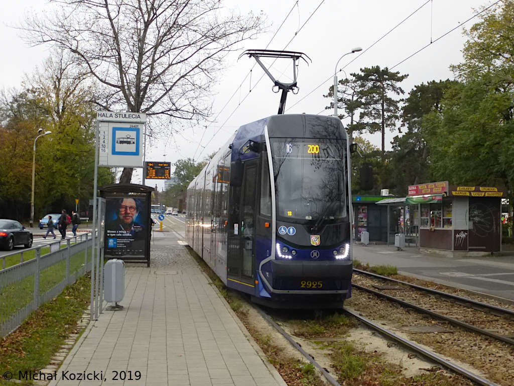 Moderus Beta No. 2925 on route 16 is stopping at Hala Stulecia, Wroclaw, Poland, 29.10.2019.