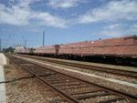 2 composições de vagões plataforma CP tipo Rlps utilizados para transporte de "packs" de cimento ensacado. Foto tirada no verão de 2003 na fábrica de cimento CIMPOR em Alhandra (Lisboa).
