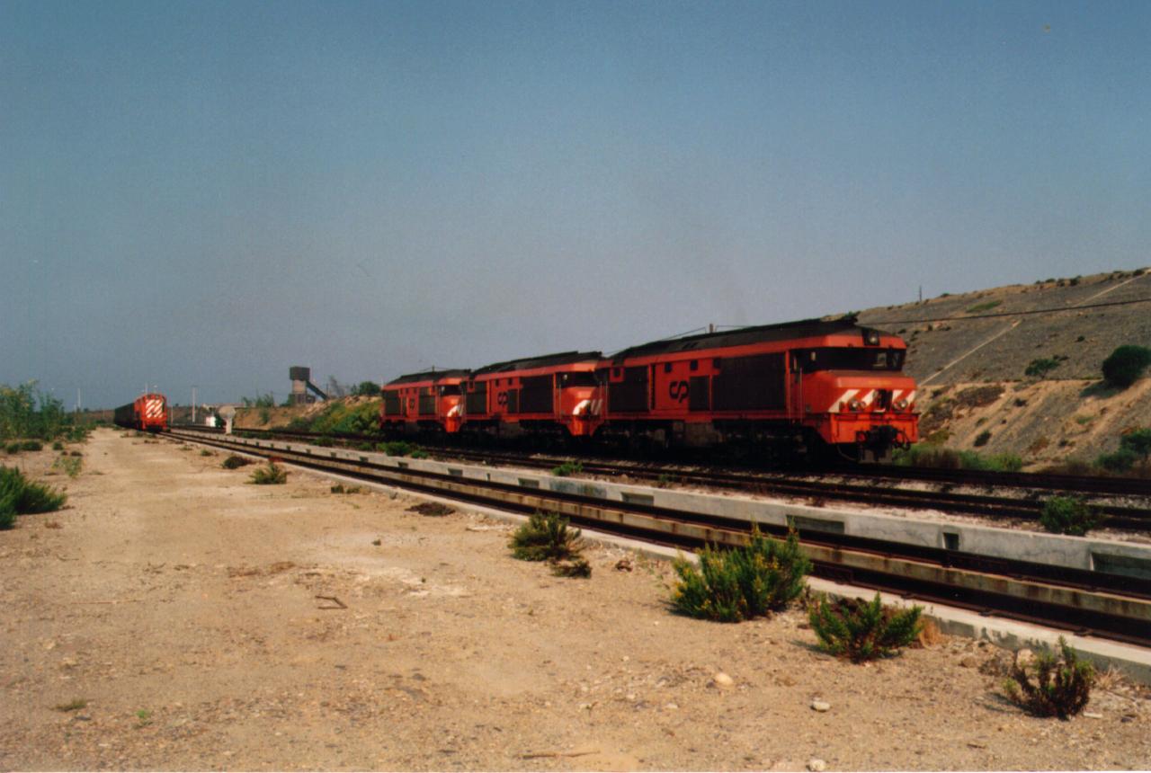 Sines station with an empty coal train arriving from Pego with locomotives 1902, 1910 and 1904 and another coal train ready to leave for Loulé with locomotives 1521 and 1505 (August 16, 1995)