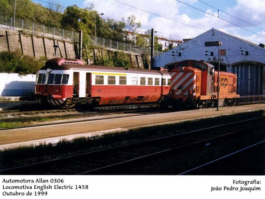 eAutomotora Allan 0306 e Locomotiva English Electric 1458 em Coimbra-B Outubro de 1999