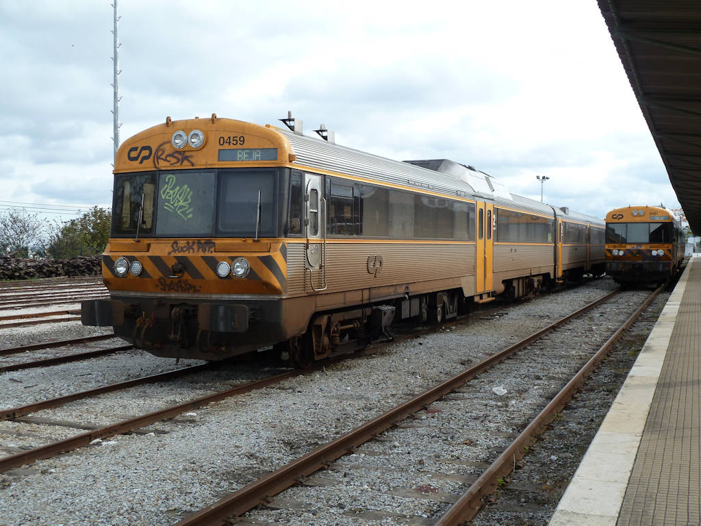 CP - Portugal Two trainsets class 0450 have recently been modernised (with new interior and yellow livery) for Intercity services on Casa Branca-Beja connecting to the recently modernised and electrified railway line to Evora (Linha do Alentejo). Trainset 0461 is seen stabled in Beja. Beja, 21-11-2011 Digital photo by Marco van Uden |