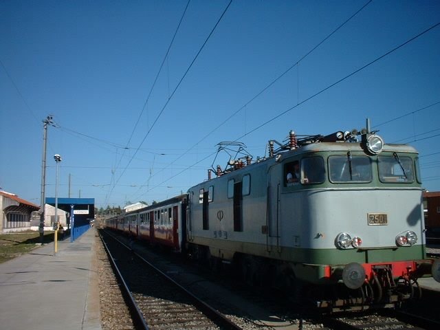 Vintage electric locomotive 2501 in the (true?) original colours passing portela de sintra just after 0186 steam loco