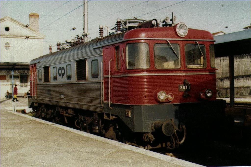 CP class 2550 electric engine at Vila Nova de Gaia station yard, February 2002. Mechanical parts are Henschel-Siemens and the stainless-steel body work was built in Portugal by Sorefame, under license of Budd. It derives from the 2500's.