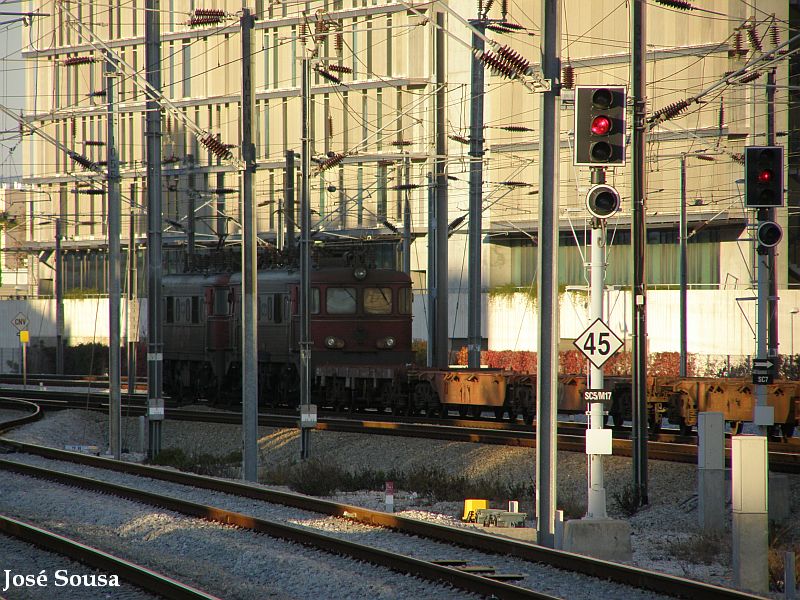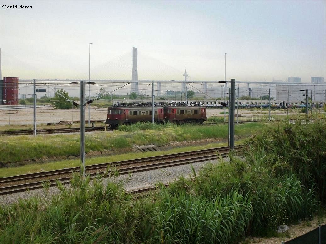 Braço de Prata railway station, 15-03-2007. 2 electric locomotives, class 2550 of the CP heading north with a freight consist of flat cars loaded with containers, plus one class 1960 locomotive.