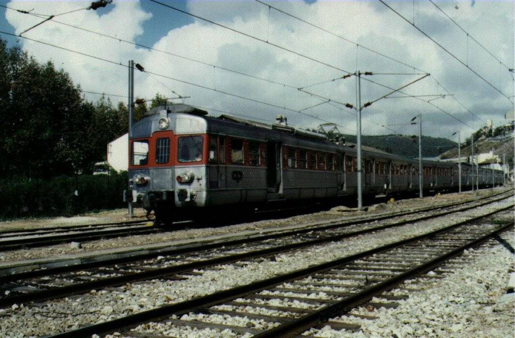 Photo and scan by Antonio Raposo. EMUs 2012 and 2008, belonging to series 2000, arriving at Alcantara Terra station, Lisboa. The first unit, originally all in inox, has been refurbished and had a red stripe painted at the window level. (October 28, 1995) |