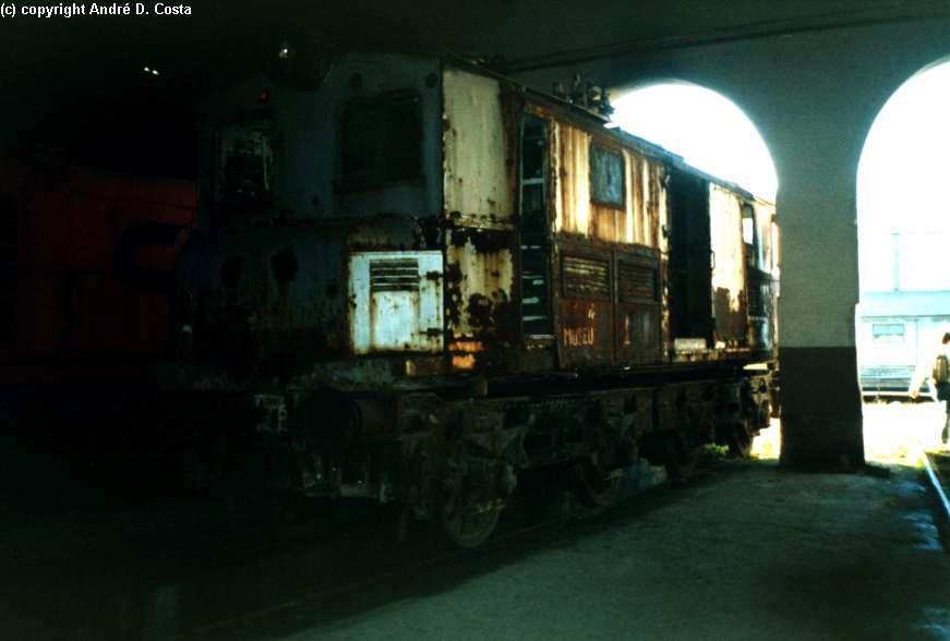 Antiga locomotiva eléctrica da linha de cascais pertencente ao Museu Nacional Ferroviario. Está á espera de ser restaurada nas Oficinas do Barreiro. Março de 2002