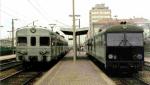 Espinho (Portugal), august 1997. Broad gauge EMU-3 2115/2108/2116 as regional train Porto - Coimbra & narrow gauge DMU 9415/9425/9405 as regional train Espinho - Oliveira de Azemeis.