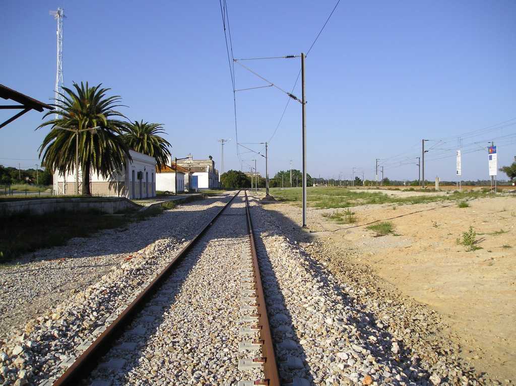 Estação de Aguas de Moura, linha do Sul. Linha da esquerda vai para o Poceirão. Linha da direita vai para o Algarve.