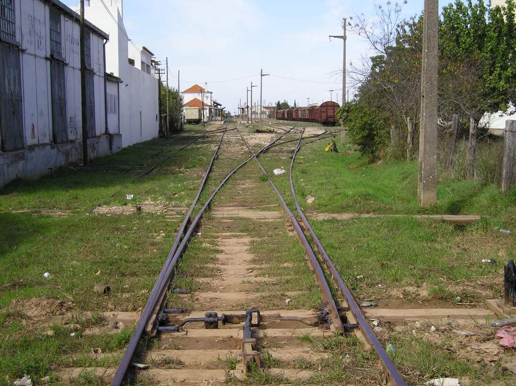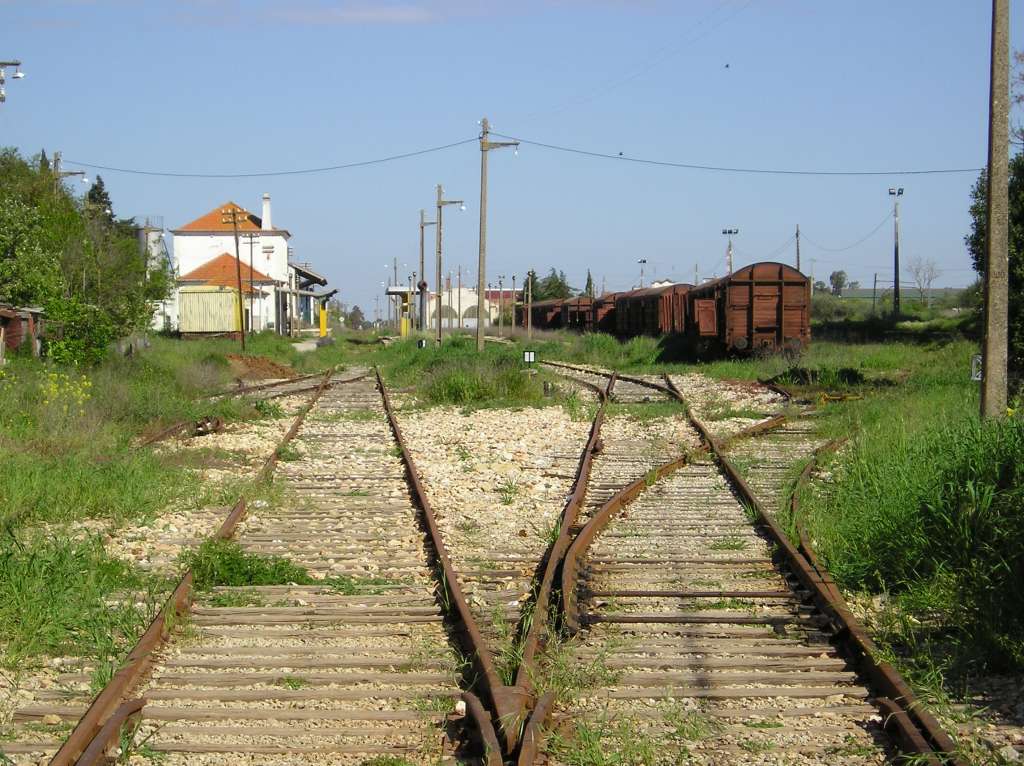 Estação de Estremoz, linha de Évora, só para mercadorias. Encerrada enquanto se substitui a linha entre Casa Branca e Évora. À direita as linhas provenientes de Portalegre (encerrada) e Évora (suspensa)