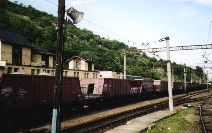 Faccpps gondolas carrying crushed rock await departure from Sighisoara.