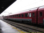 A second class passenger car type "Bee" of CFR (Caile Ferate Romane / Romanian Railways) at railway station Bucuresti Nord in composition of IR 1644 from Bistrita Nord.