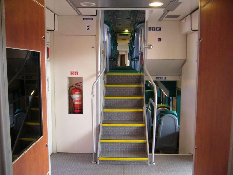 An interior in second class double deck passenger car "Bmee" of CFR (Caile Ferate Romane / Romanian Railways) at railway station Bucuresti Nord with IR 1552 from Ploiesti Sud.