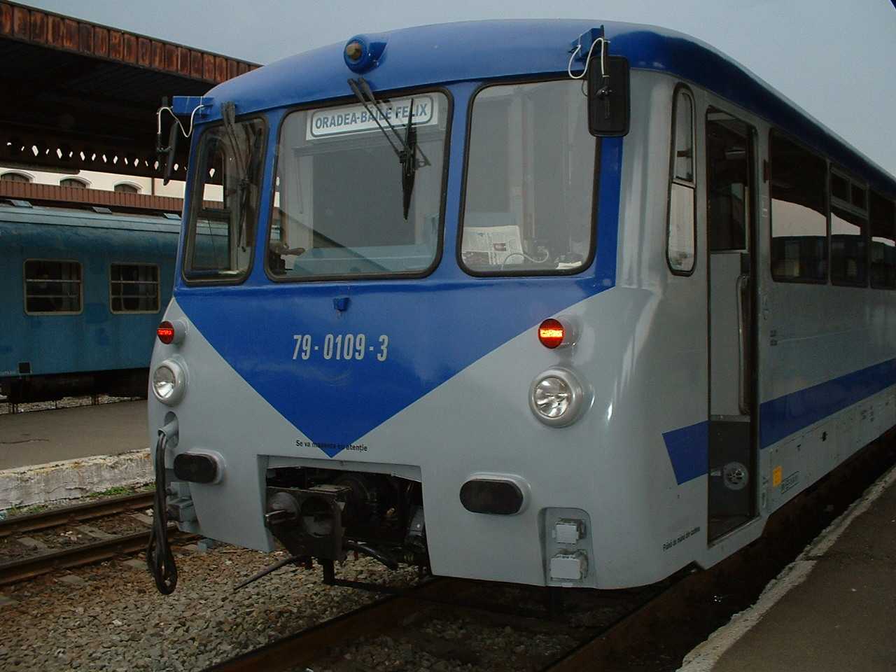 CFR "new" DMU class 79. The ex-DR, ex-DB, "Ferkeltaxe" DMU's, after being refurbished at "Remarul 16 Februarie" from Cluj-Napoca, have found a nice and quit popular welcome from passengers. This picture is taken in the station of Oradea, after the DMU came from Baile Felix. Their place is insured on the Diesel lines around Oradea (my nice hometown), the biggest Diesel-only depot in Transylvania and probably in Romania. In Oradea there a six lines converging (of which four main-lines and five still got passenger traffic), all Diesel-powered. 11 May 2003