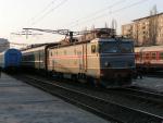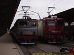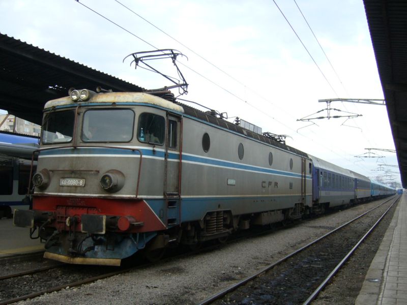 An electric locomotive 91 53 0 40 0194-3 of CFR (Caile Ferate Romane / Romanian Railways) at railway station Bucuresti Nord with IR 12196 from Timisoara Nord.
