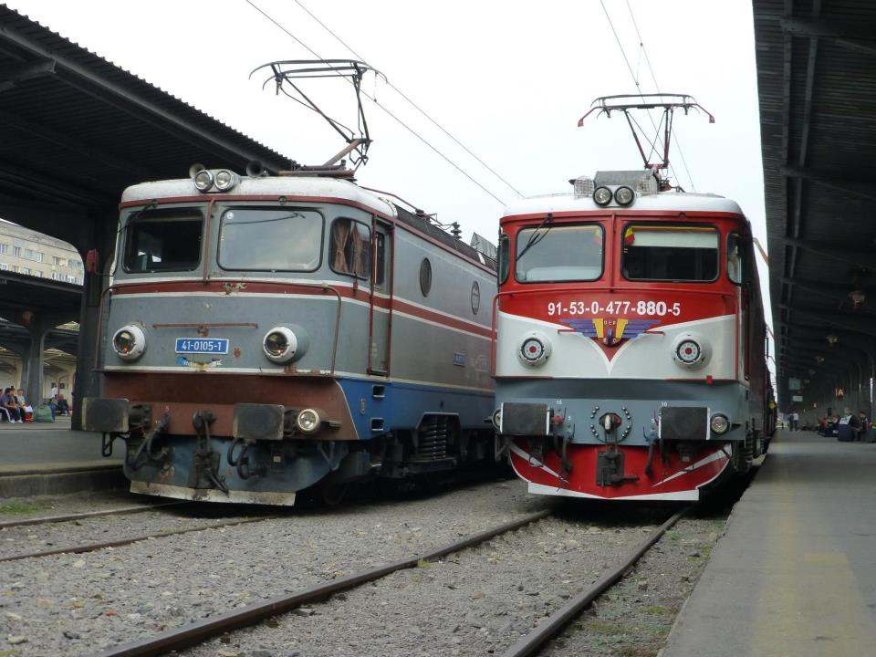 Express trains locomotives 41-0105-1 and 477-880-5 at Bucuresti Nord in March 2013.