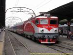 An electric locomotive with number 91 53 0 477 742-7 of CFR (Caile Ferate Romane / Romanian Railways) standing at railway station Budapest K. with IR 347 "Dacia" from Wien Westbahnhof to Bucuresti Nord. A video movie about departuring the train from central railway station Budapest K. you can see on this adress: