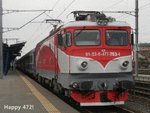 An electric locomotive 91 53 0 477 821-9 of CFR (Caile Ferate Romane / Romanian Railways) at railway station Bucuresti Nord with IR 1623 to Sibiu.