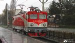 An electric locomotive with number 91 53 0 477 821-9 of CFR (Caile Ferate Romane / Romanain Railways) on railway station Buuresti Nord with Inter Regio train 1644 from Sighetu Mar. via Deda - Brasov.