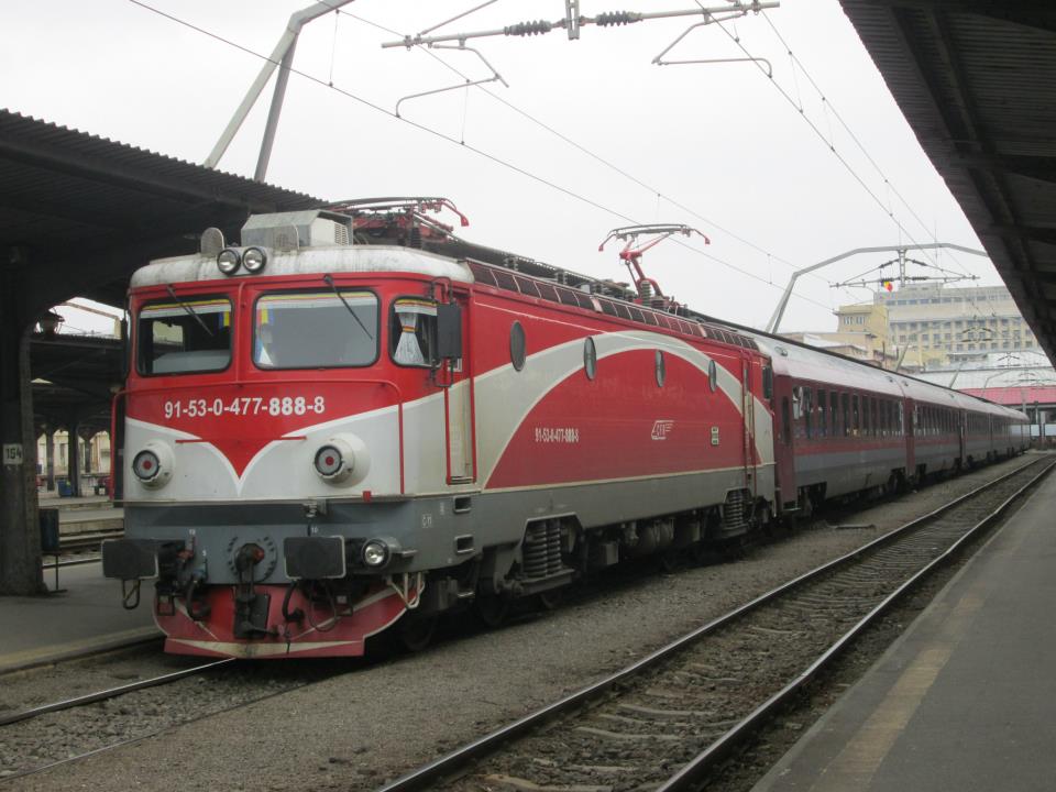 Locomotive 477-888-8 at Bucuresti Nord/Bucharest main station with IR 1557 fast train train in October 2012.