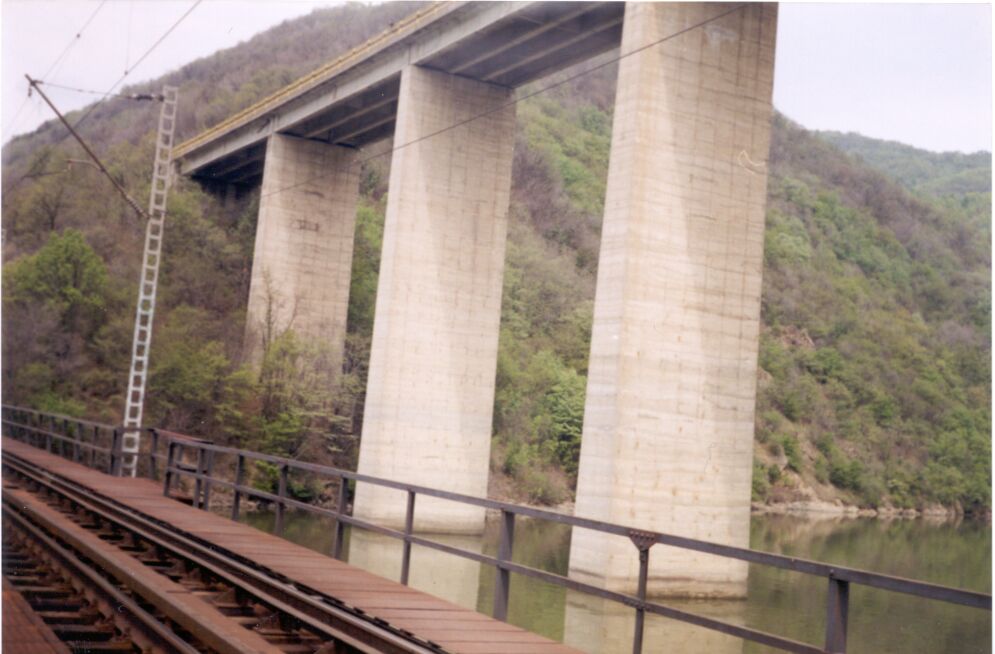 Podul de cale ferata din imagine a fost scena unui grav accident feroviar: un tren de marfa e deraiat (datorita unei incarcaturi incorect pozitionate la un vagon si datorita solicitarii vagoanelor pe acest traseu, precum si datorita starii proaste a traverseolr de lemn ce sunt inca folosite la poduri), cateva vagoane cazand in Dunare (unde se afla si acum; datorita adancimii mari a apei, peste 30m, nu au putut fi scoase). Acest accident a produs avarii la structura podului, dat acestea au fost reparate superficial; exista un proiect pentru schimbarea totala a unei parti din structura metalica a podului, deocamdata se circula cu restrictie. De fapr, pentru intreg tronsonul se impune o reparatie capitala, care este inclusa in planurile CFR, insa perspectiva unei cai ferate duble, de mare viteza prin defileul Dunarii ramane putin fantezista. Zwei Brücken (links unten: Metalleisenbahnbrücke auf die Hauptstrecke Bukarest-Temeswar; oben: Viadukt der europäischen fernstrasse E70) über einen Golf des Donaus (bei der Mündung der Bahna ins Donaustausee). Mit dem Bau der Wasserkraftwerke und des Staudamms beim Eisernen Tor, wurden die Eisenbahnlinie und die Strasse, die früher nebeneinander dem Ufer entlang fuhrten, 30 m hochgezogen. So blieben die Bahnhöfe und die Siedlungen unter Wasser. Das benötigte der Bau von technischen Kunstwerken (Tunnels, matalische Brücken, lange Viadukte, Schutzwände u.ä.); wenn man also diese spektakuläre Trasse sieht und durchfährt, kann mann nur Respekt für die jenigen die mit ihrer Arbeit das möglich gemacht haben. Es passiert immer, ob es Tag oder Nacht ist, dass Fahrgäste die im Zug sitzen, diese ganze 30km-ige Strecke, durchs Fenster schauend, durchfahren. Auch um 2 Uhr Nachts! Also, bleibe die Eisernen Tore eine echte Sehenswürdigkeit. Fotoaufnahme von Lucian-Boian Brujan (brujivici@fastmail.fm/@web.de), april 2002. |