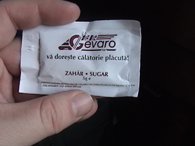This is the rear side of a packet of sugar, provided with a cup of coffee on the CFR (Romanian Railways) Bosfor train from Istanbul to Bucharest-Nord. A cup of coffee on the Bosfor train costs € 1.00 or the local equivalent in Bulgarian Leva, Turkish Lira or Romanian Leu, depending on the physical location of the train. Note I was in Bulgaria at the time of the coffee purchase. © 2006 Josh Hanz (josh_hanz@hotmail.com) |