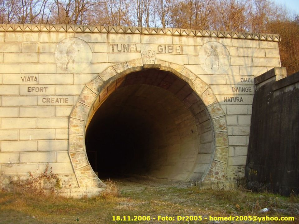 C.F.R. Entrance in the Gibei Tunnel, of Line 219 (Rm. Valcea - Valcele). On it it's written "Omul a invins natura" (Man defeated the nature). This is a big lie, since the nature destroyed the line after only a few months of service. Now the tunnels, viaducts, bridges and other elements are waiting for better days. Photo by Dr2005 - transportbucuresti.trei(a)gmail.com, Read more about Line 219 |