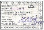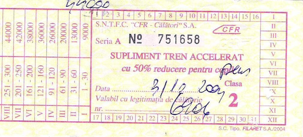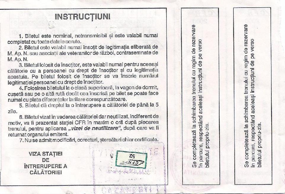 CFR train ticket issued inside the train. If a passenger get into a train from a station without ticket seller, he can buy the ticket from the conductor, at normal price (not at ,, train price", wich is 50% more expensive than the normal ticket and has no discounts), including discount for students, children, retired persons etc. if he request the ticket immediatly after he get in the train. Scan: Dr2005 - homedr2005(a)yahoo.com More pictures with Romanian Traisn can be found at www.trenuri.uv.ro |