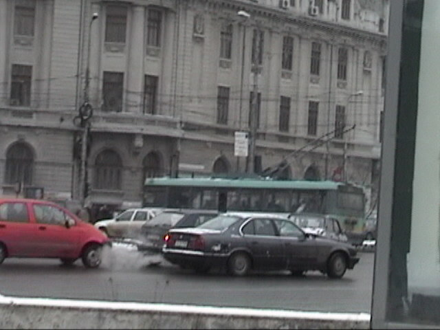 A trolley bus from Piata Victoriei is approaching Piata Romana. Off the picture to the right is an LED billboard, which at the time was showing ads for Dacia automobiles. Taken Tuesday 14 February 2006. © 2006 Josh Hanz (josh_hanz@hotmail.com) |