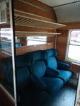 An interior of mixed first and second class passenger car , type "ABl" of ZS ( Zeleznice Srbije / Serbian Railways) standing on central railway station Sofia in composition of the international train "Nusic" with number EN 293 Euro Night from Beograd.
