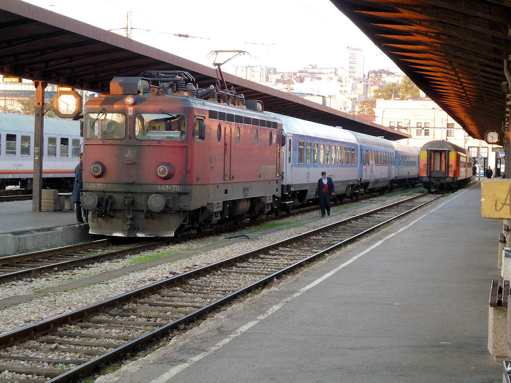 An electric locomotive with number 441 704 - 5 of ZS ( Zeleznice Srbije / Serbian Railways) at railway station Beograd Centar with International train "Lovcen" with number B 432 from Bar to Zemun.