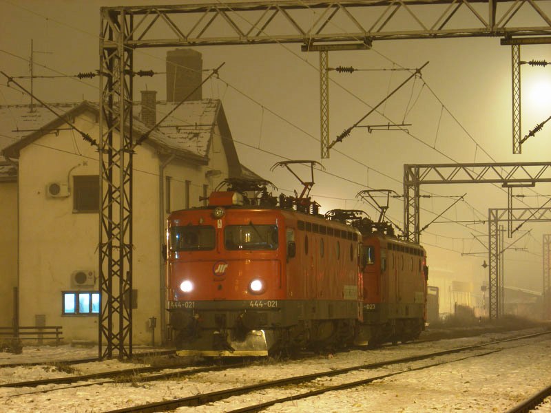 | Electric loco ZS class 444, locomotives 021+023 wait to service on Lapovo main station by winter night, 26.02.2009. photo by Stokic Sasa (stole802002@yahoo.com) |