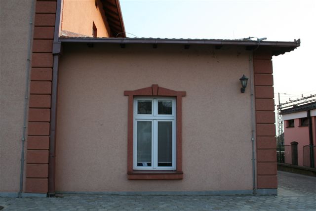 Ein Fenster des restaurierten Bahnhofsgebäudes PALANKA in der serbischen Stadt