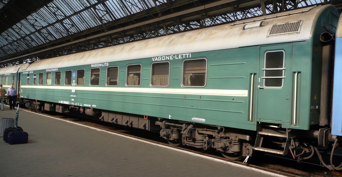 RZD sleeping car WLABm in train R 209 "Vltava" to Moskva, leaving Praha hlavni nadrazi at 22:21.