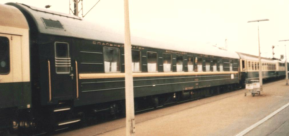 This sleeping-car ran a through service on Moscow-Madrid in Summers 1990, 1991 and 1992, via Berlin, Karlsruhe, Basel, Bern, Geneva, Lyons, Toulouse, Irun and Valladolid. It would change bogies twice (Brest-Litovsk and Hendaye). The SZD numbering as well as the Soviet emblems are very much in evidence on this pic. Madrid-Chamartin. June 1990. Photo by Perolo (perolo@tranvia.org) (Acknowledgements), from Tranvia.org. Posting and comment by P.L.Guillemin (plguillemin@yahoo.fr) |