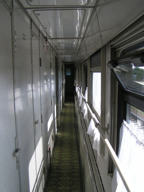 Corridor in modernized RZD RIC sleeping car Budapest - Moskva in train 16 (Budapest/Uzhgorod - Moskva).